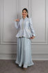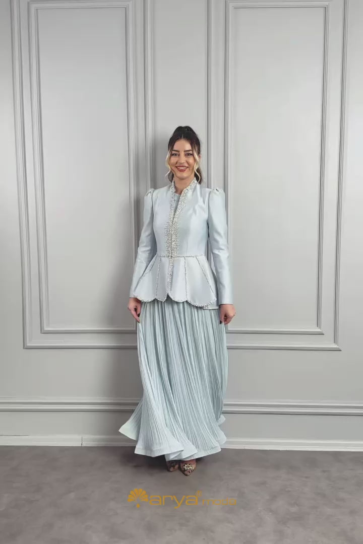 طقم فستان بتنورة مكسرة وجاكيت مطرز بالكريستالات -ازرق