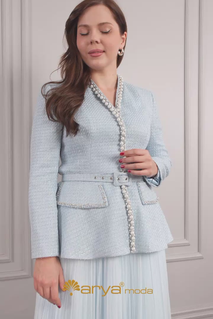 تم تصميم جاكيتنا المصنوع من قماش التويد بتفاصيل من اللؤلؤ على طول الياقة حتى نهاية الجاكيت، مما يضيف لمسة فاخرة. يتميز الجاكيت أيضًا بتفاصيل الجيوب وحزام يلتف حول الخصر ليمنح مظهرًا عصريًا. مع تنسيق التنورة التي تتميز بتأثير الطيات الضيقة وتفاصيل الدانتيل على الحافة، تم تحقيق تناغم كامل في التصميم. سيكون اختياركم لهذا الطقم المثالي من الجاكيت والتنورة في مناسباتكم الخاصة خيارًا مثاليًا، كما يمكنكم تنسيق التنورة مع قطع أخرى لإطلالات متنوعة.