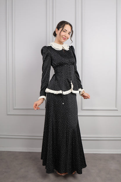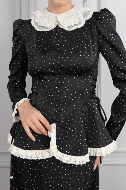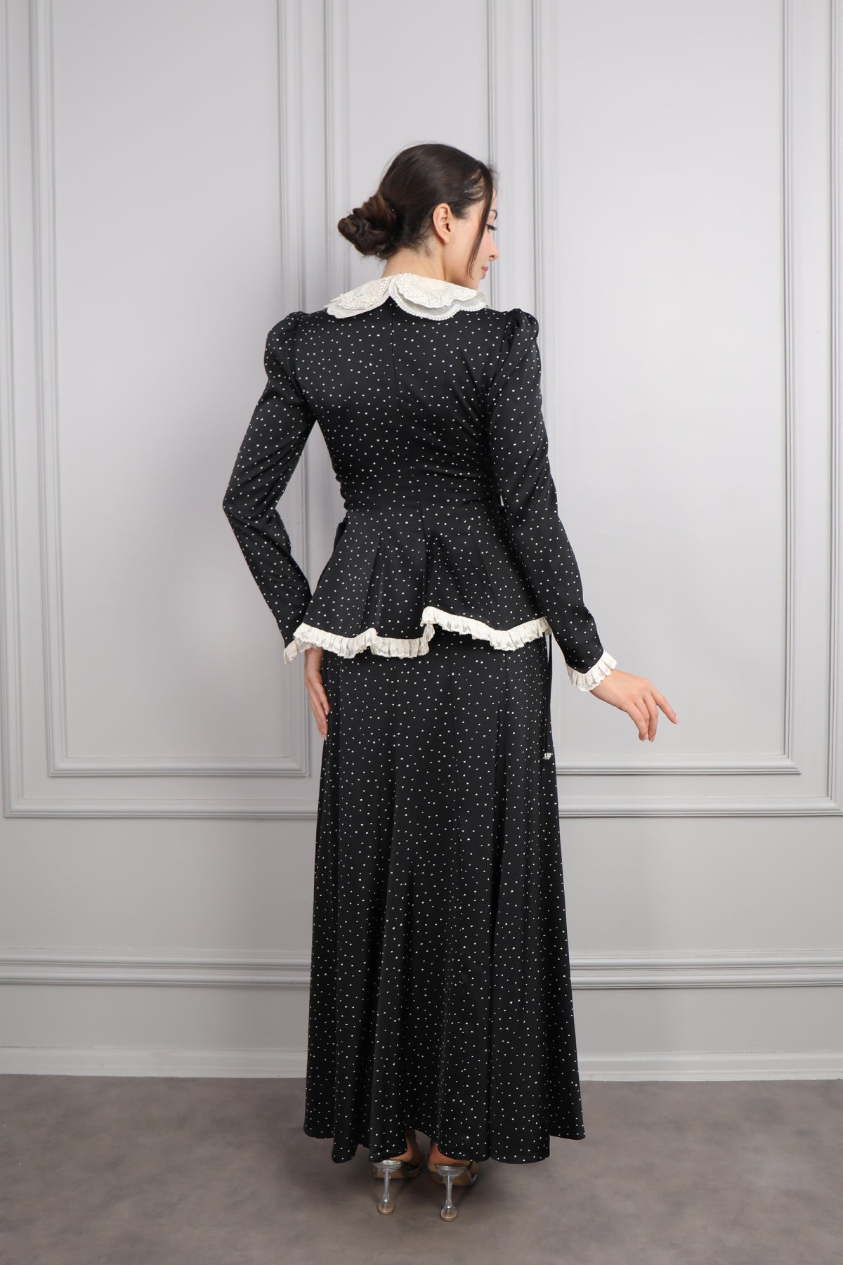طقم تنورة ساتان منقط مزين بالكشكشة ومصمم بياقة اطفال -اسود