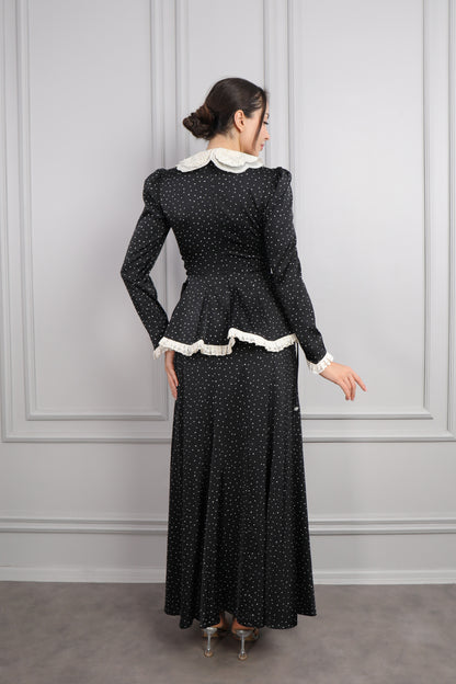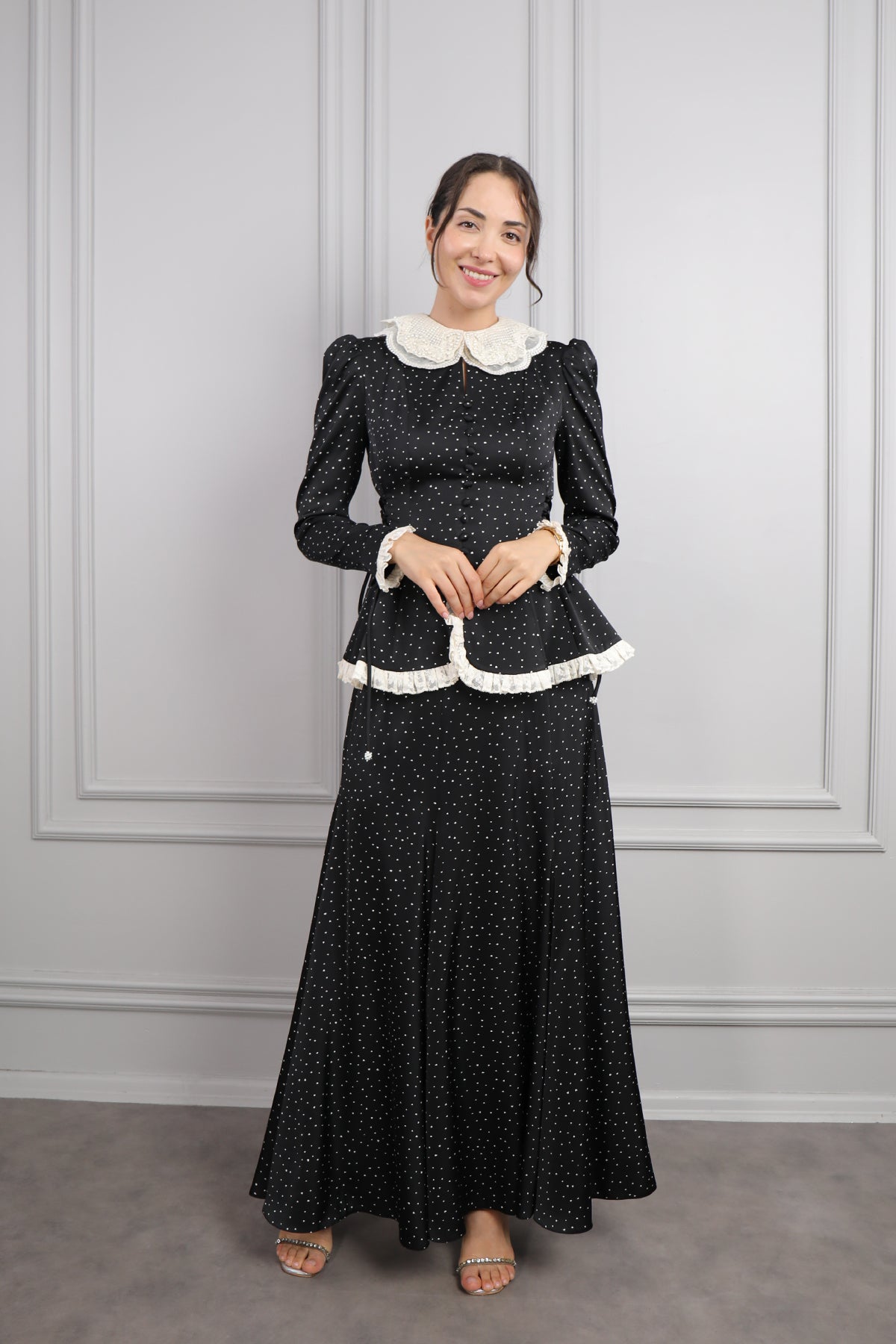 طقم ساتان منقط يجمع بين الأناقة واللمسة الكلاسيكية. يتميز بجزء علوي بياقة "بيبي" مع قصّة تبرز الخصر وتمنح قواماً أنثوياً رشيقاً، بينما تأتي التنورة الساتان بقصّة انسيابية تمنح راحة وأناقة في الوقت نفسه. بفضل قماشه اللامع وتفاصيله الكلاسيكية، يناسب هذا الطقم المناسبات الخاصة مثل الخطوبة، الأعياد والدعوات الأنيقة، كما يمكن تنسيقه لإطلالة يومية مميزة.