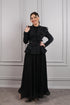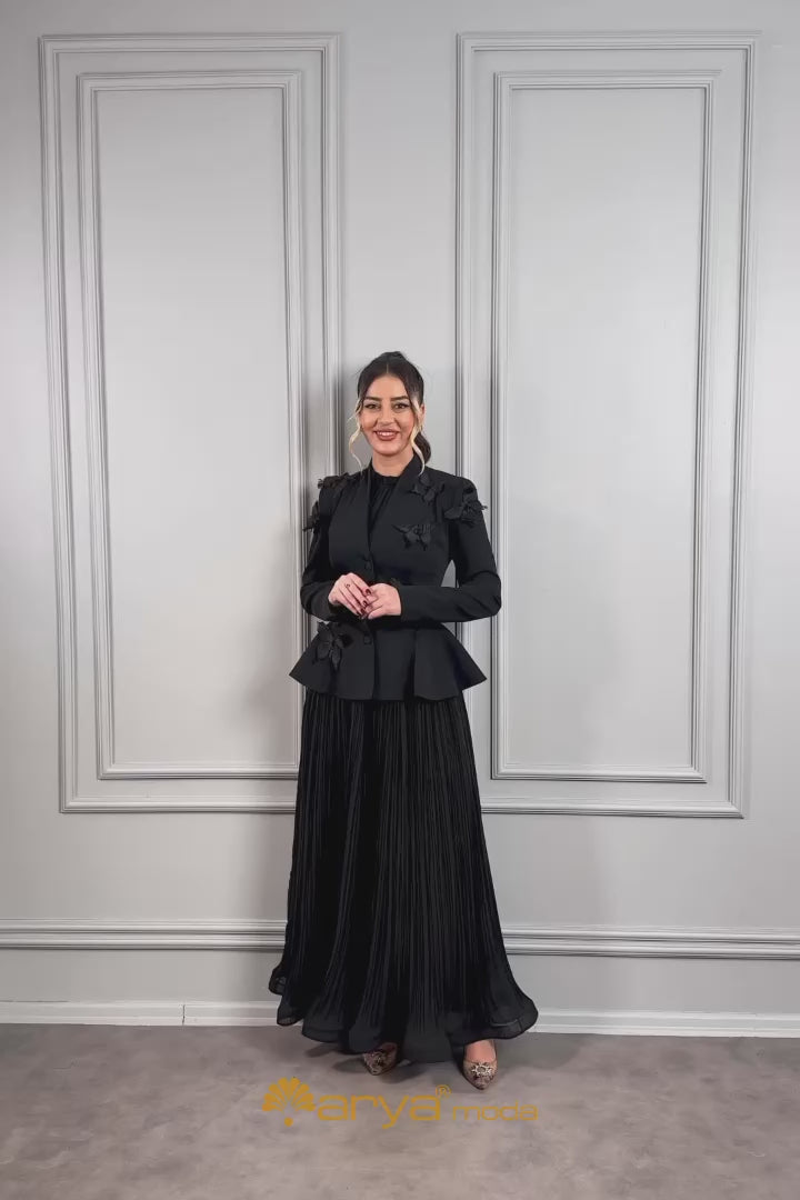 تم تصميم الفستان من الشيفون بياقة مكشكشة وتنورة مكسرة لاضفاء حركة على الفستان, بينما تم تزيين الجاكيت بتفاصيل على شكل فراشات ليكتسب تصميما لامعا وانيقاً. تم اضافة ازرار في الجزء الامامي من الجاكيت, بينما تم انشاء مظهر كورسيه في الجزء الخلفي باستخدام الحبال ليضفي لمسة عصرية وفريدة. سيكون اختيار هذا الطقم في مناسباتك الخاصة او الفعاليات خياراً مثاليأً لكم.