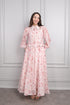 تم تصميم البلوزة بياقة قميص مطرز بالكريستالات على نهايته وعلى اطراف الاكمام ليمنحه مظهراً انيقاً, بينما صمم الطقم بالكامل من قماش الشيفون المزخرف. باكمام منتفخة تضيف لمسة من الحيوية, في حين يكتمل الطقم بتنورة طويلة وواسعة لتضفي تناغماً متكاملاً. اختياركم لهذا الطقم في مناسباتكم الخاصة او الفعاليات يعد خياراً مثالياً لكم.