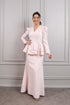 تم تصميم هذا الطقم بياقة مثلثة مزينة بتطريز من الخرز على الأكتاف والأكمام، بالإضافة إلى حزام حبل يلتف حول الخصر لإضافة تفاصيل أنيقة. الجزء السفلي من الفستان مصمم بقصّة غير متماثلة مع مظهر طبقات، فيما يتمتع الطقم بتنورة طويلة تمنحه لمسة أنيقة. سيكون اختيار هذا الطقم، الذي يمكن تنسيقه مع قطع أخرى، مثاليًا لكم للمناسبات الخاصة أو الدعوات.
