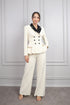 طقم بنطال وجاكيت يجمع بين الأناقة الكلاسيكية ولمسة عصرية. الجاكيت مزين بـ أزرار مزدوجة وياقة سوداء متباينة ويبرز القوام بفضل القصّة الضيقة عند الخصر تضيف أناقة متوازنة. البنطال واسع القدم يوفر الراحة مع الحفاظ على المظهر الرسمي والأنيق. مناسب للأعمال المكتبية والسهرات الرسمية على حد سواء.