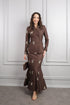 طقم تنورة بتطريزات خرزية واكسسوار حقيبة -بني