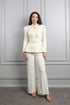 طقم بتصميم أنيق يتميّز بياقة قابلة للربط تضيف لمسة أنثوية راقية. الجزء العلوي مزخرف بتطريزات خرزية دقيقة تمنح التصميم إشراقة ناعمة، البنطال بقصته المريحة والانسيابية توفّر راحة طوال اليوم مع إطلالة متوازنة. مناسب للمناسبات الخاصة، السهرات والعزائم الأنيقة.
