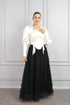 صُممت هذه البلوزة ذات الياقة المربعة بأكمام نصف طولية على شكل بالونات، وتنحصر عند المعصمين لإضفاء مظهر ضيّق. يتميز الجزء الأمامي من الخصر المصنوع بالكامل من الساتان بمظهر يشبه الكورسيه، بينما يزين الصدرية (التوب) بالتُل والزخارف المزيّنة بالخرز لإضفاء لمسة ملفتة للنظر. صُنعت التنورة الطويلة من التول مع مظهر متعدد الطبقات، مما يجعل هذا الطقم خيارًا مثاليًا للمناسبات الخاصة أو الفعاليات.