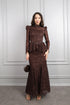 طقم دانتيل خناقي بتطريزات خرزية عالياقة والخصر باكمام شفافة -بني