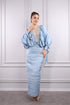 طقم تنورة ساتان وبلوزة خناقية مطرزة بالحجر -ازرق