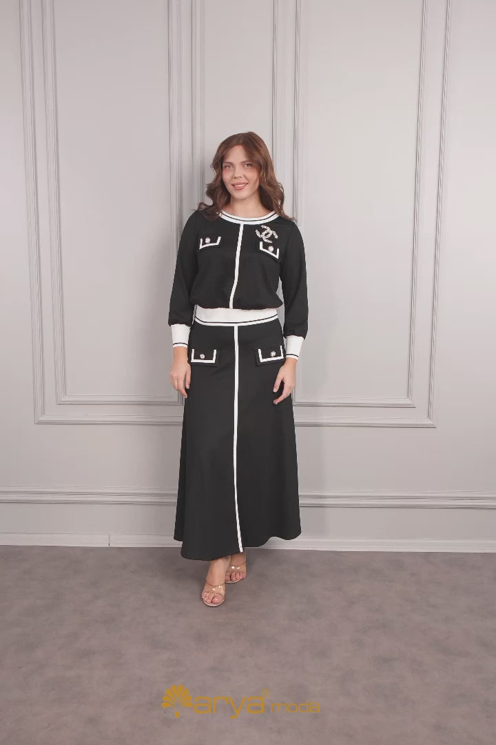 طقم تنورة بتفاصيل بروش بمقاس كبير -اسود -ابيض