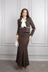 طقم تنورة وجاكيت بياقة تنربط مزين باللؤلؤ مع اكسسوار شنطة -بني